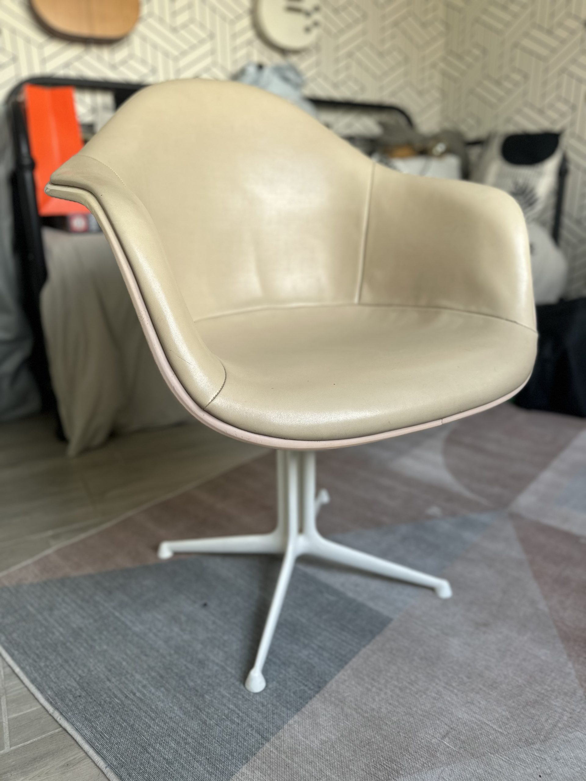 Elevate your space with a piece of design history. This is an authentic Herman Miller Eames La Fonda Armchair, featuring the iconic fiberglass shell and original cream/parchment vinyl upholstery.
