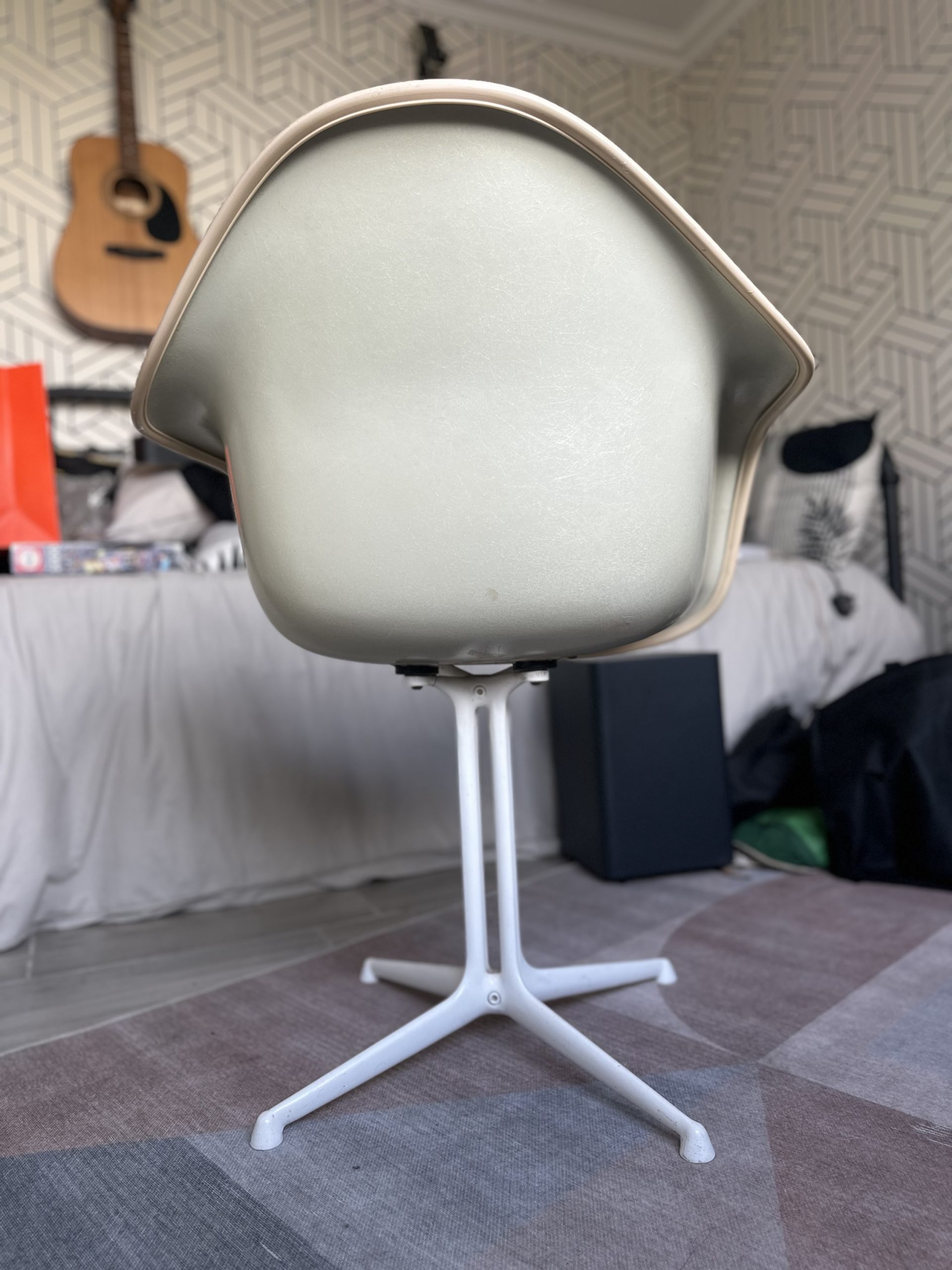 Material: Vintage fiberglass shell with a distinct visible grain.