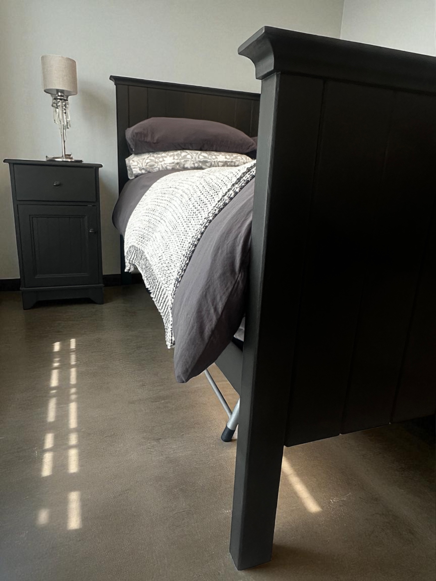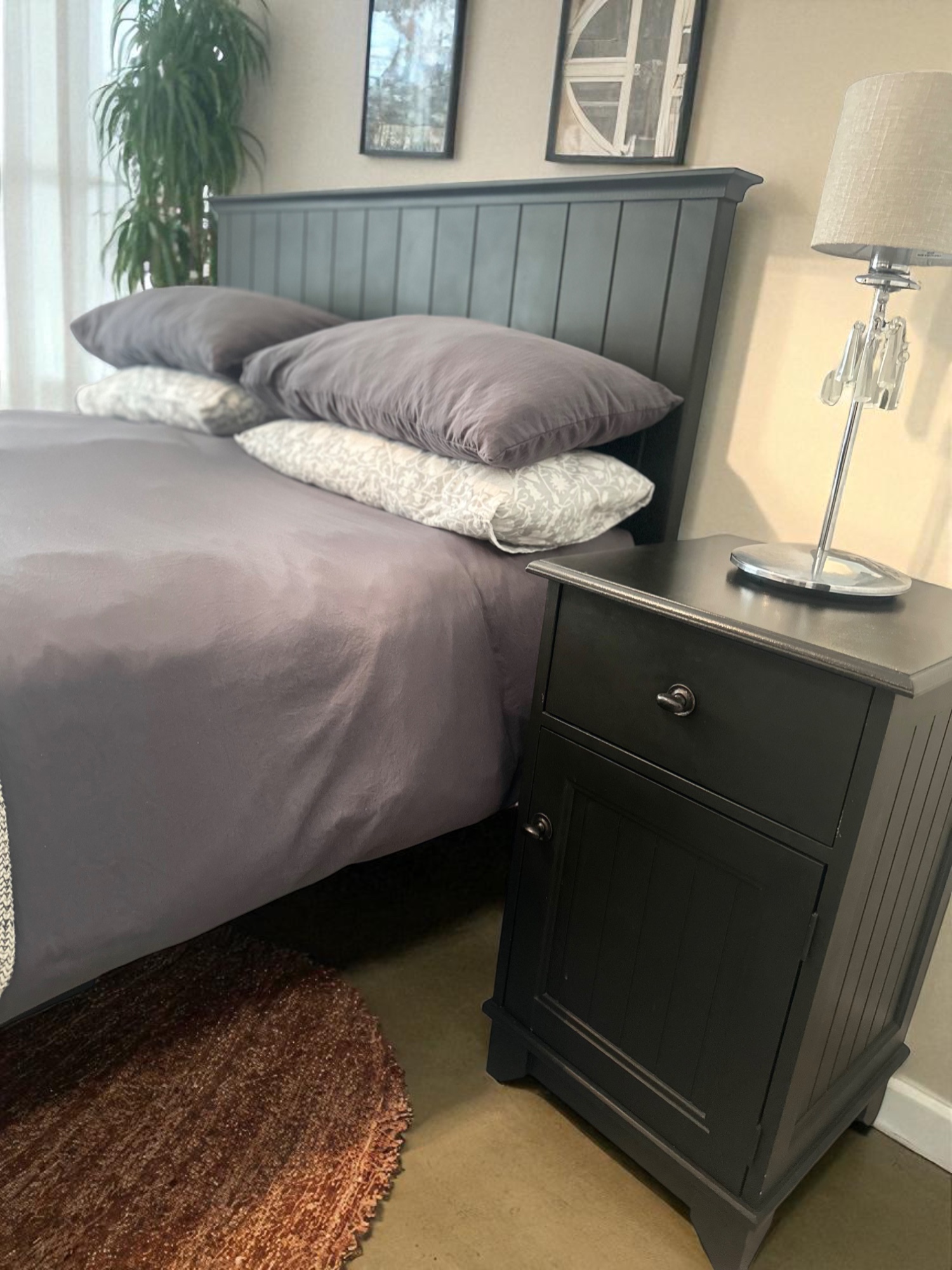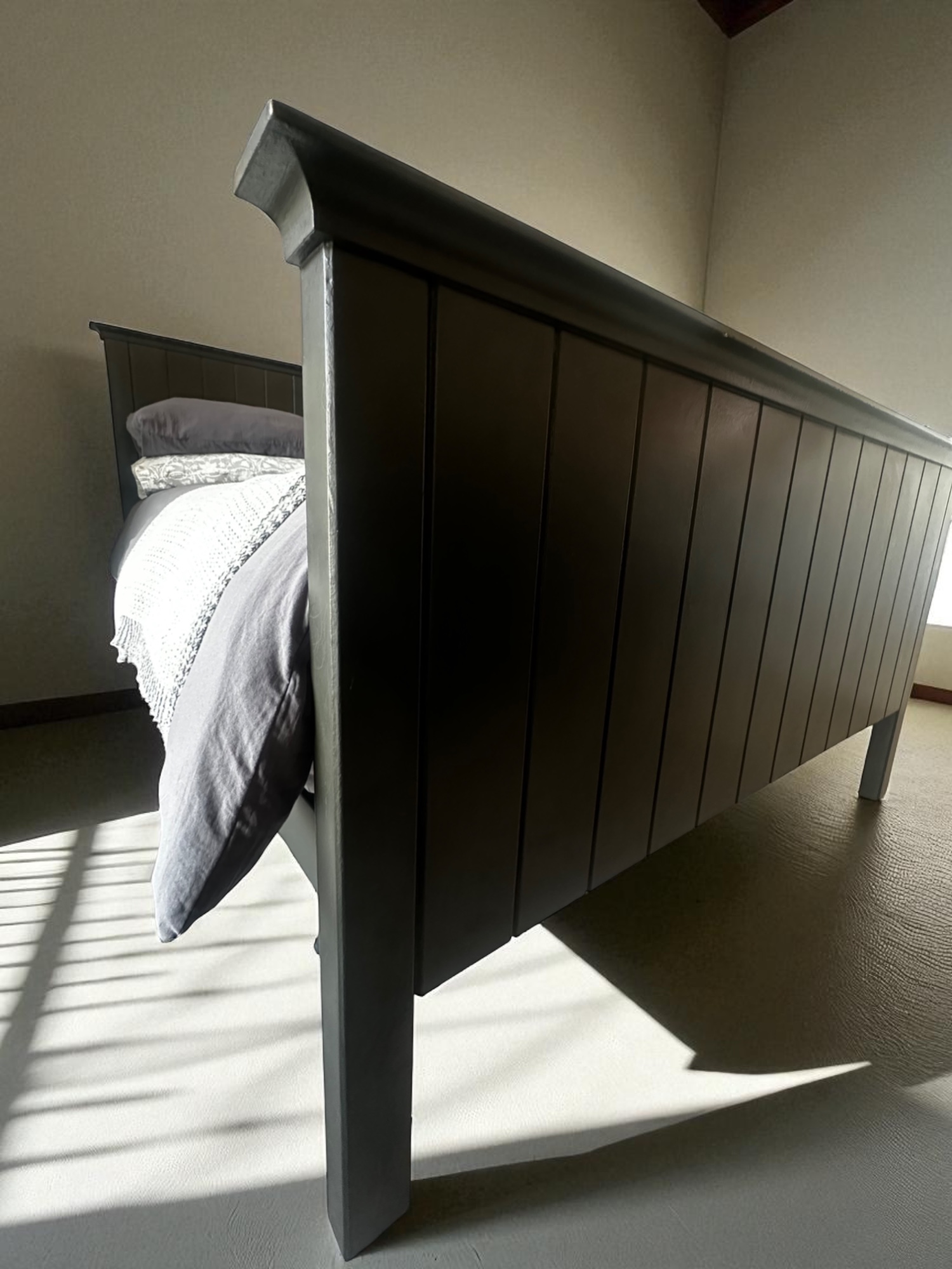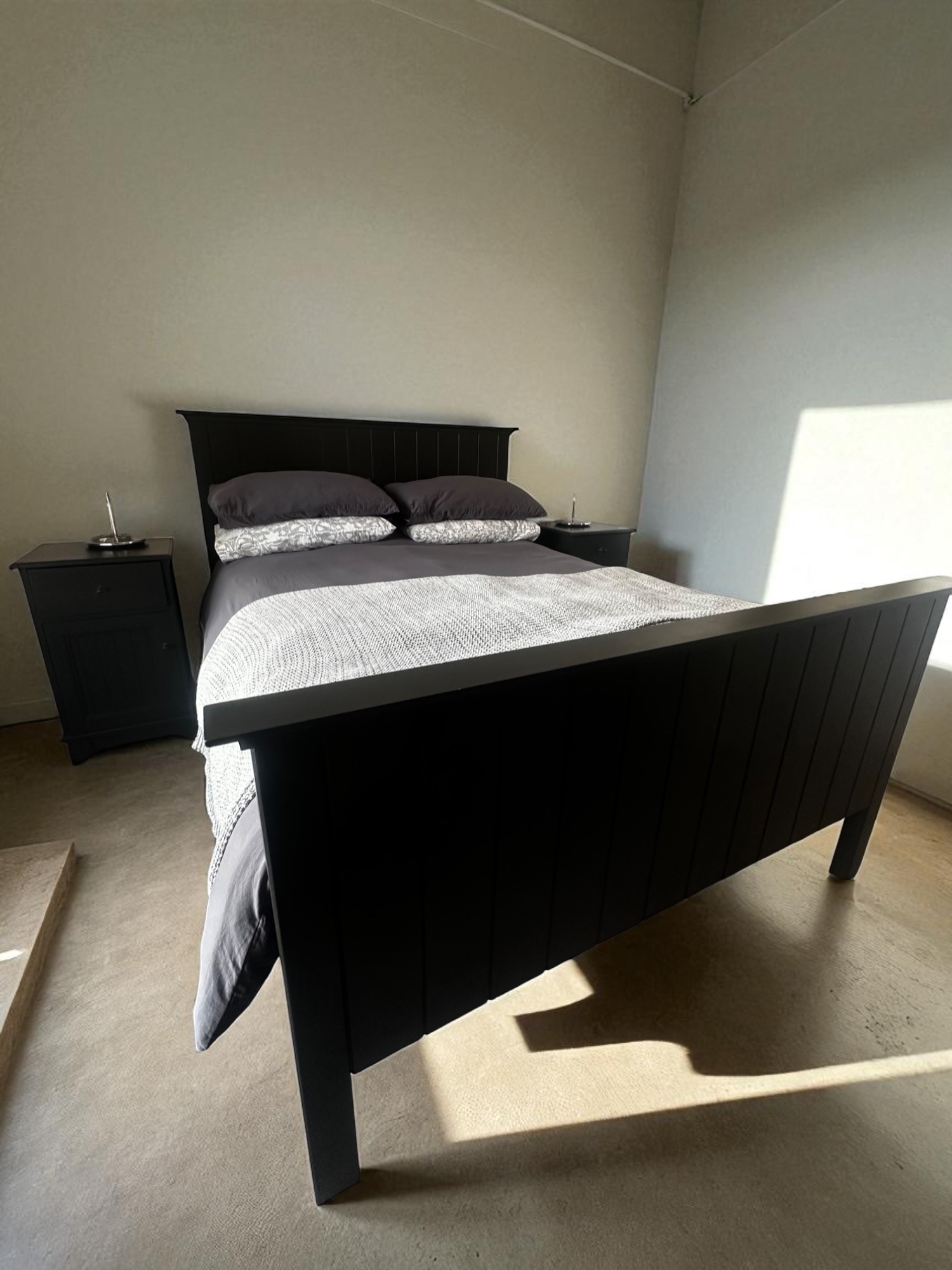 The bed’s clean-lined headboard and footboard boast vertical panel detailing that adds a timeless, classic look, while the matching bedside tables continue this theme with paneled doors and a smooth drawer for storage. Each piece is finished in a deep matte black paint, providing a sleek, versatile aesthetic that complements a variety of decor styles, from modern minimalism to rustic charm.