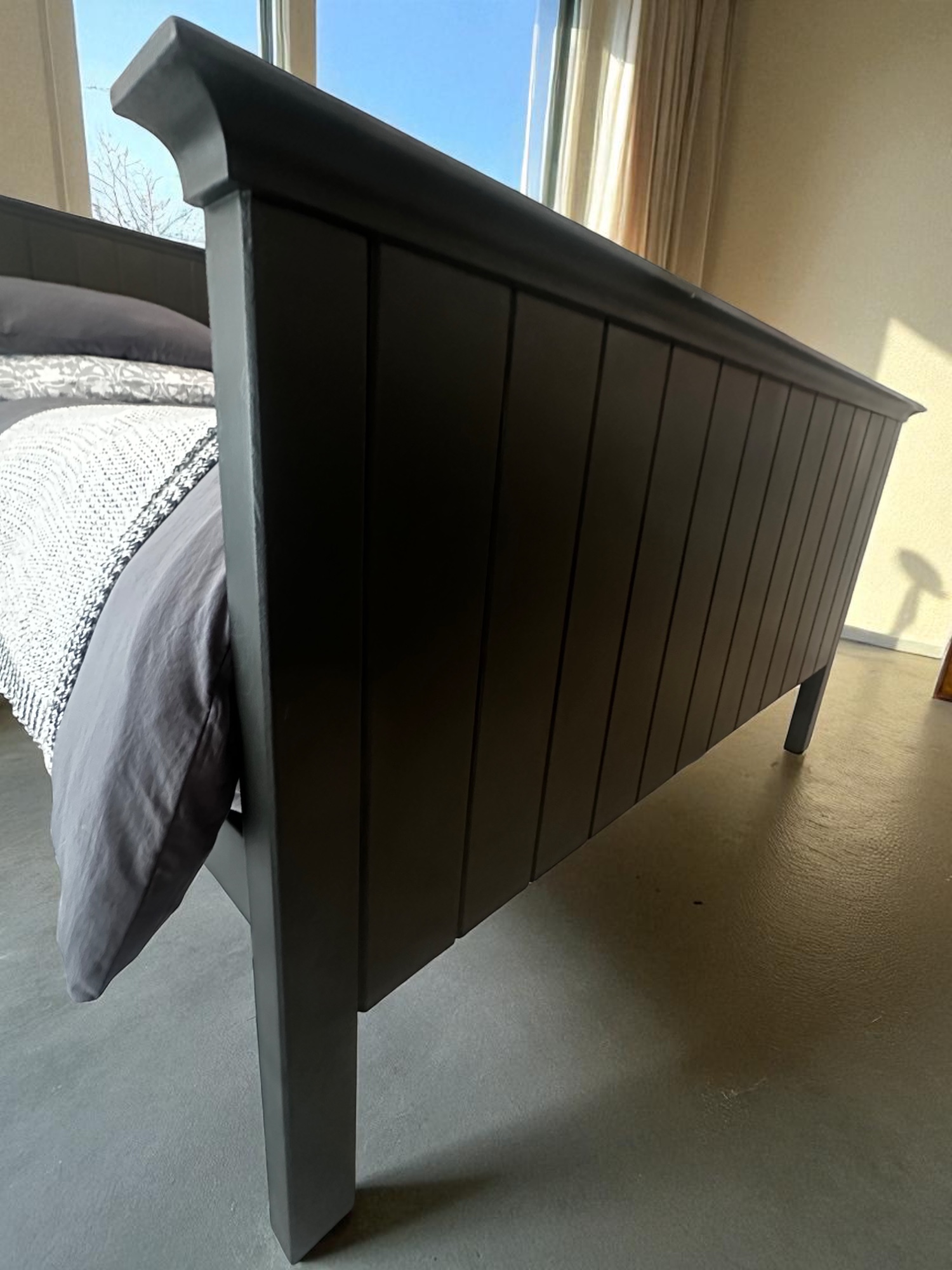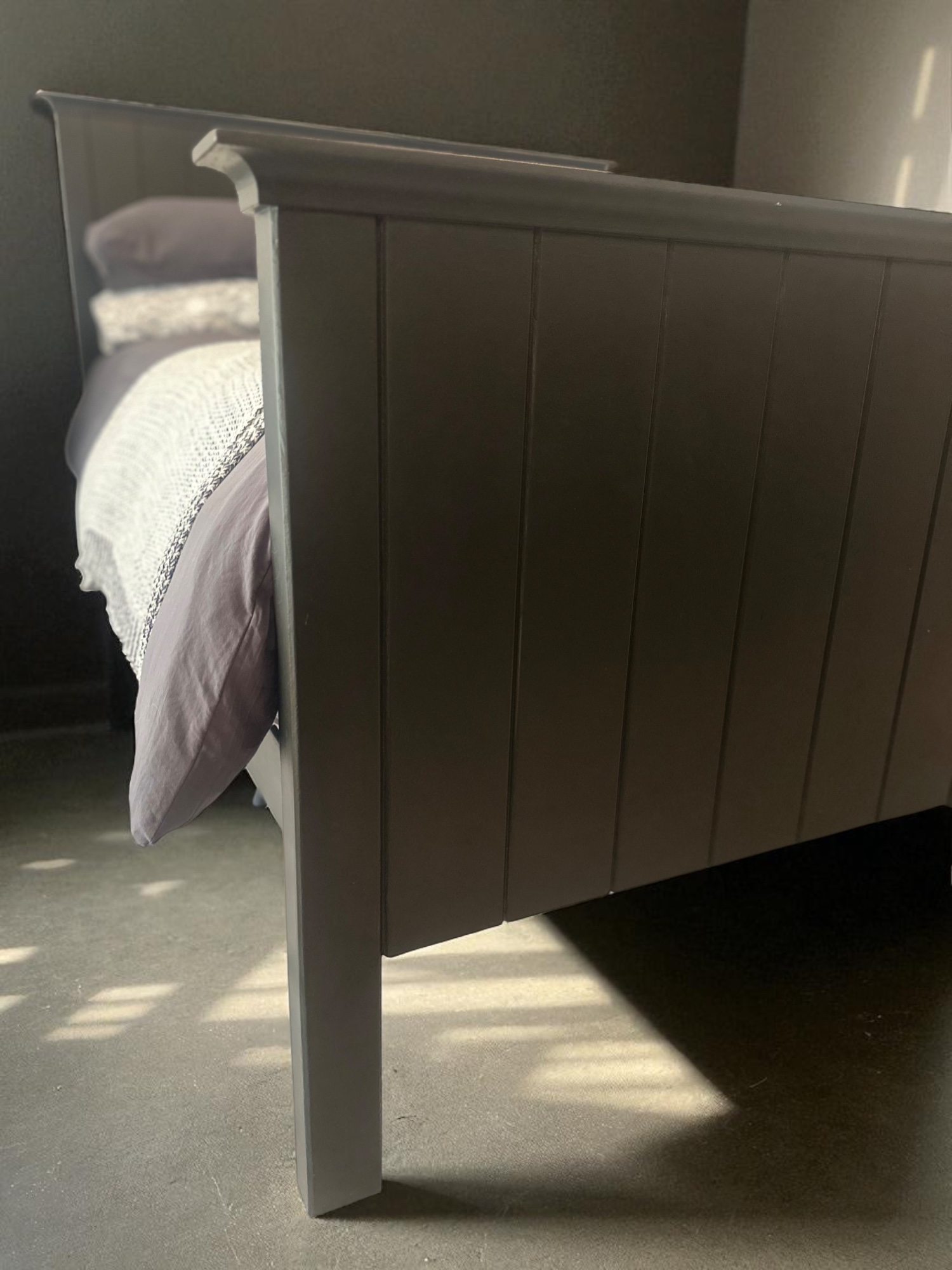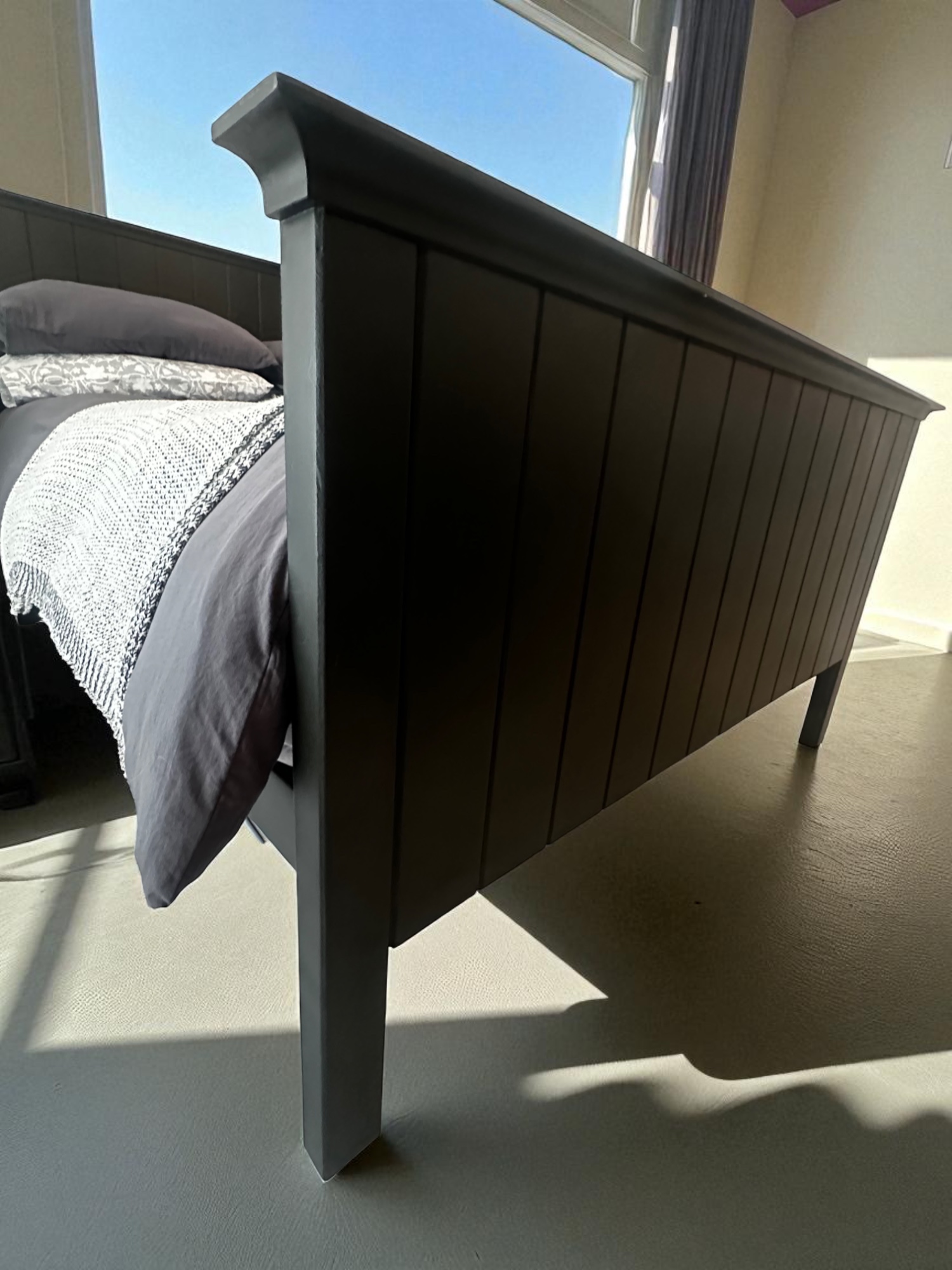 Or as low as R1250,00 / month interest-free, using your existing credit card. For orders over R2000,00.How it worksBlack painted solid wood bedroom set featuring a double bed with built-in headboard and matching bedside tables. Classic vertical panel detailing and vintage metal handles complete the elegant look.