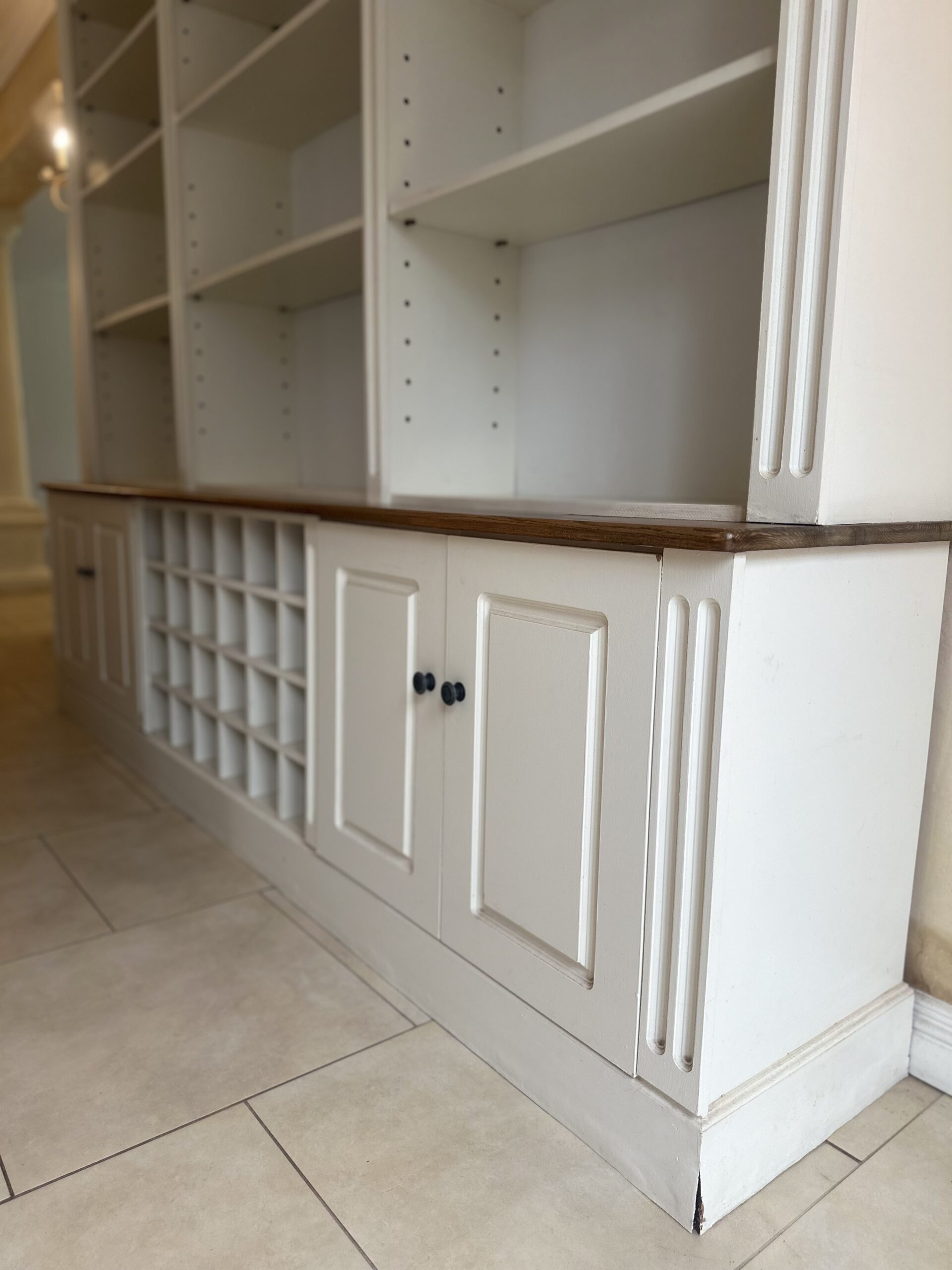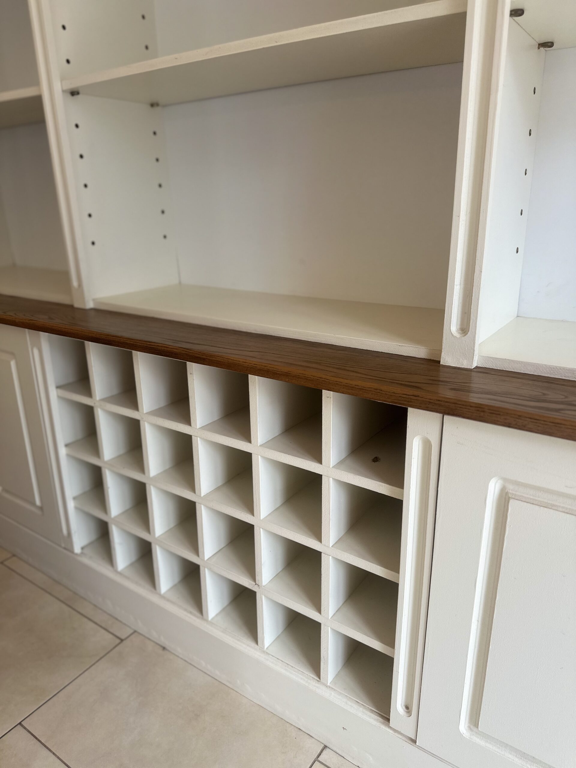 Crafted with a solid oak countertop and a soft cream finish, the design features three tall adjustable shelving columns, four lower cabinets for concealed storage, and a central 28-bottle wine rack — ideal for entertaining or display.