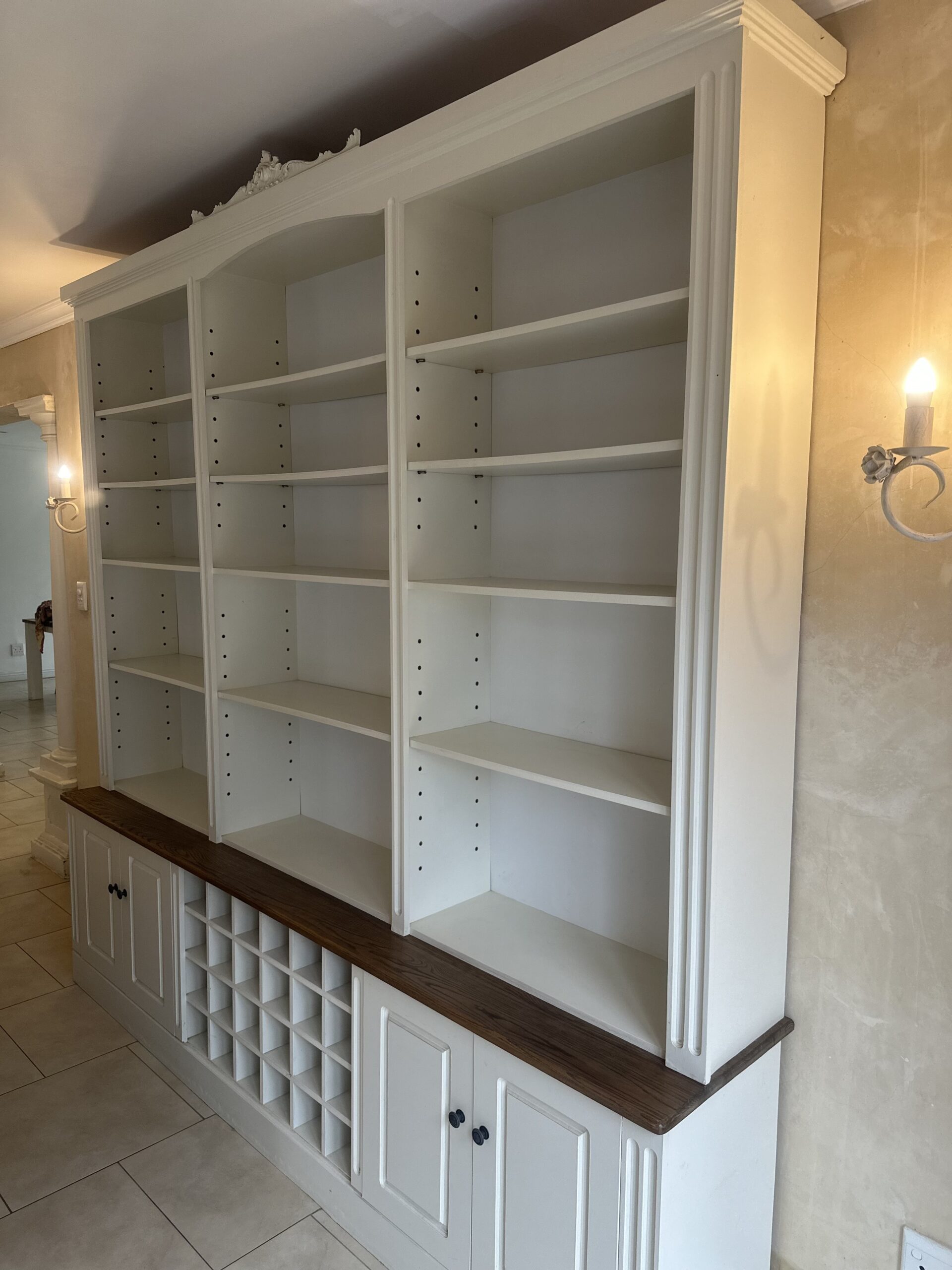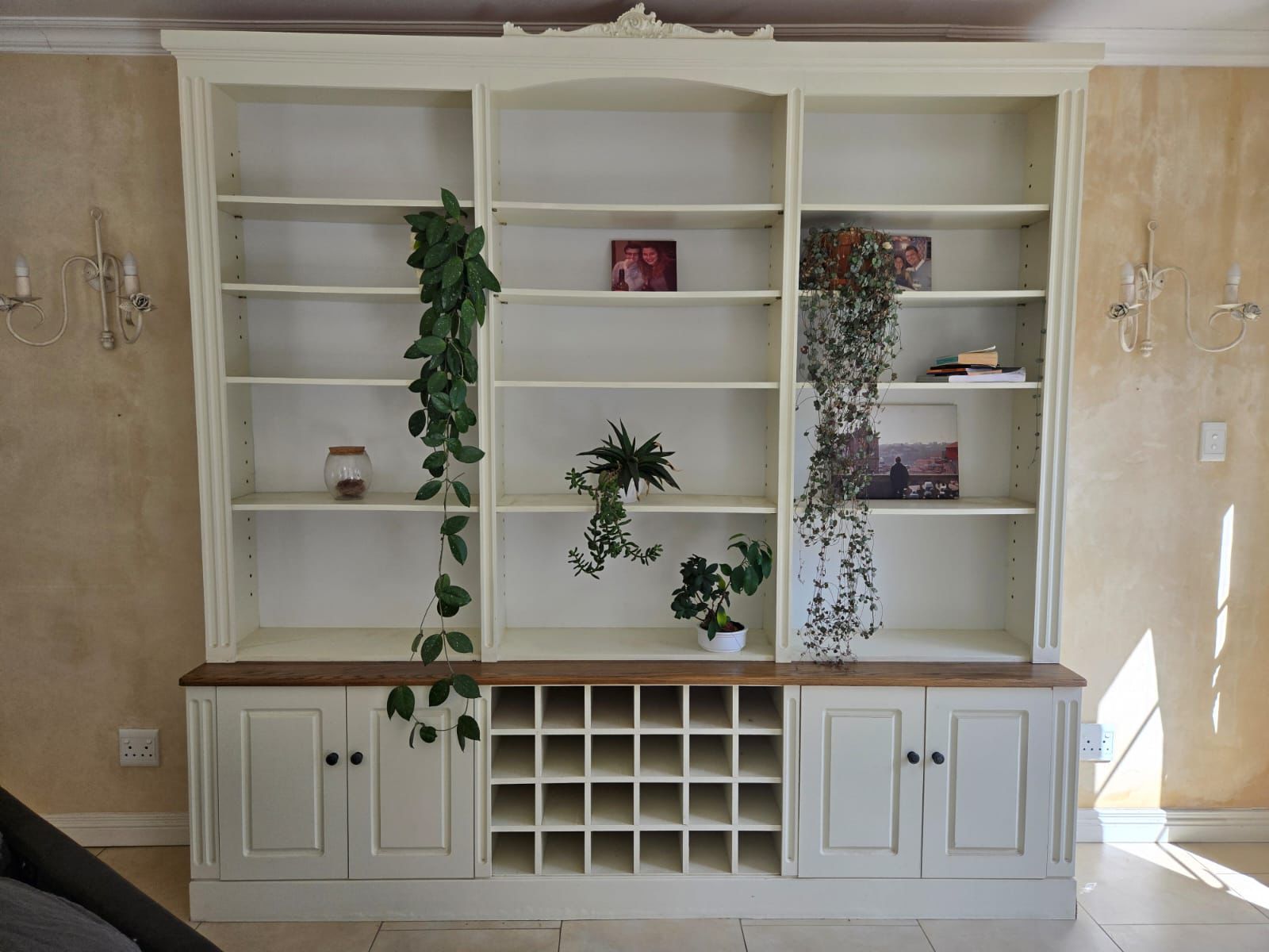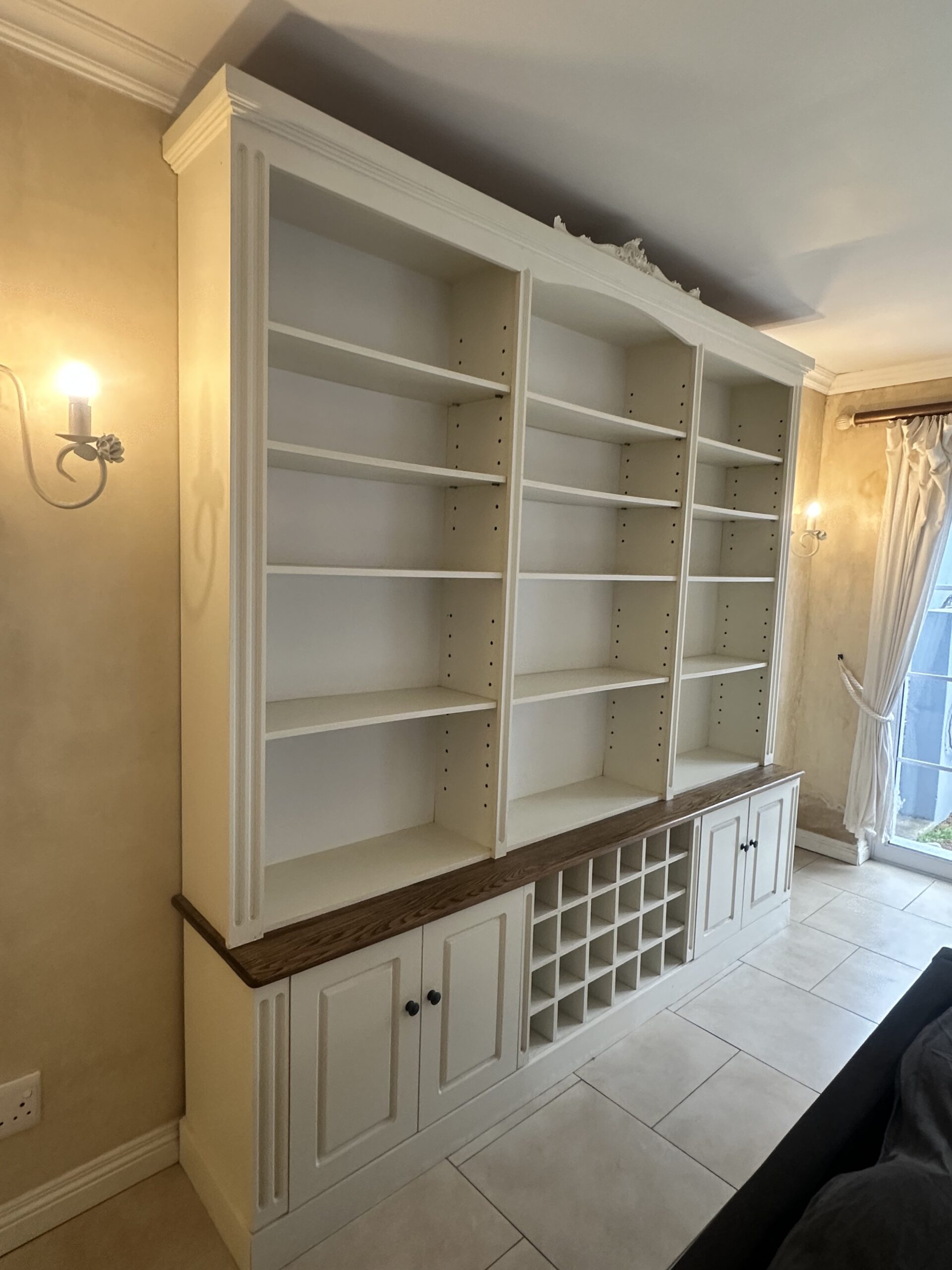 Or as low as R3250,00 / month interest-free, using your existing credit card. For orders over R2000,00.How it worksElegant cream and oak wall unit with adjustable shelving, four cabinets, and a 28-bottle wine rack. Timeless craftsmanship and practical design.