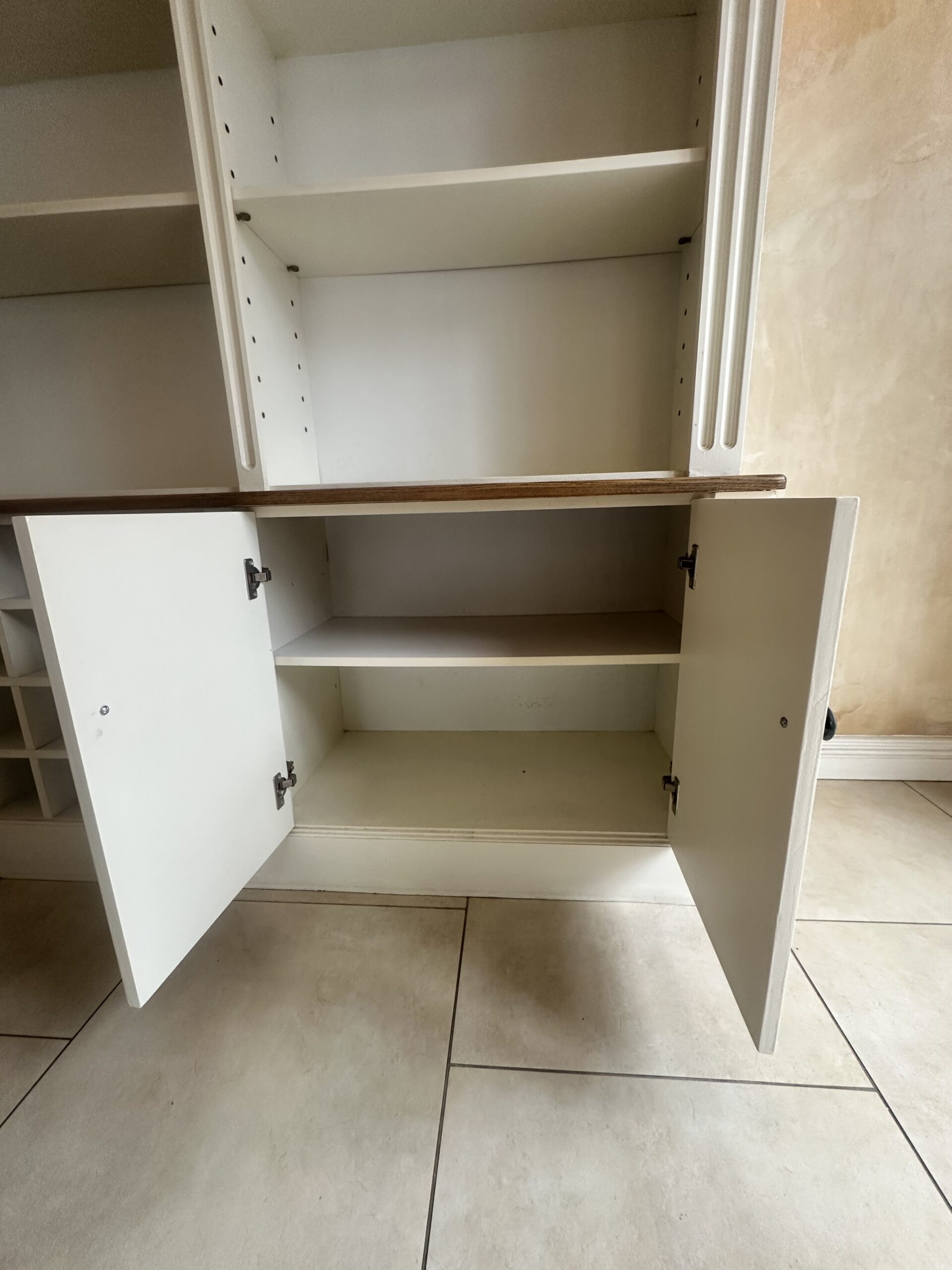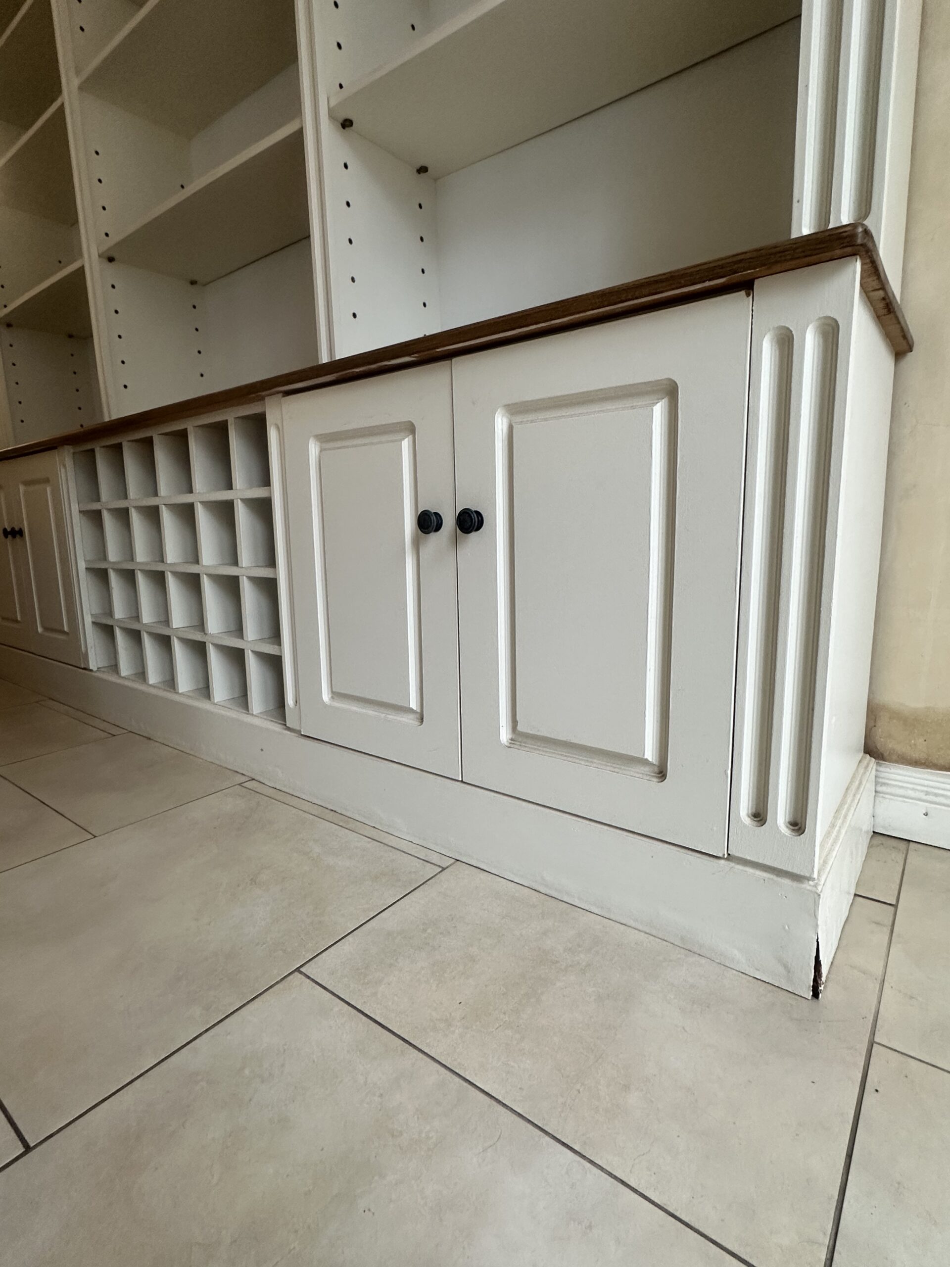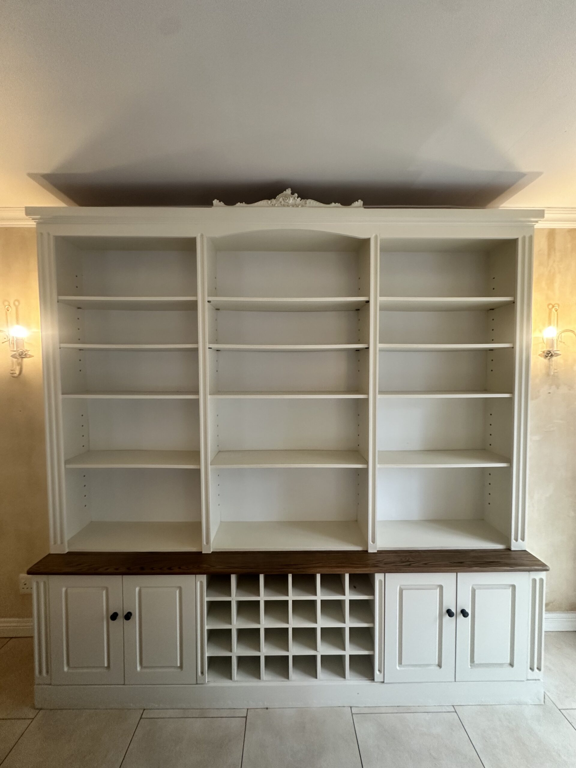 Or as low as R3250,00 / month interest-free, using your existing credit card. For orders over R2000,00.How it worksElegant cream and oak wall unit with adjustable shelving, four cabinets, and a 28-bottle wine rack. Timeless craftsmanship and practical design.