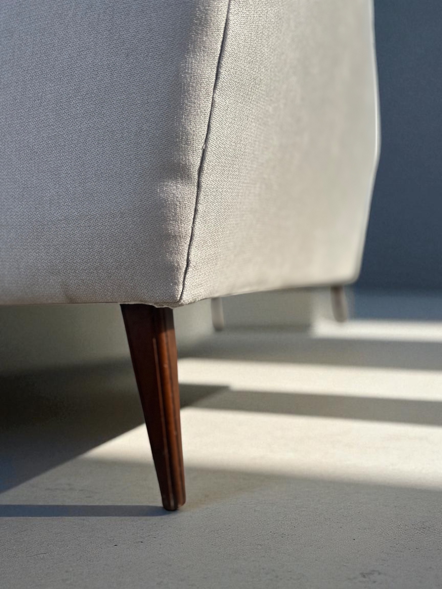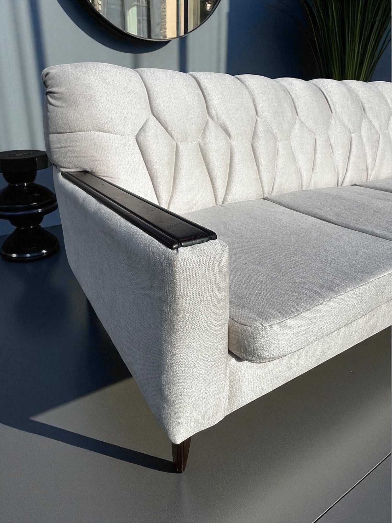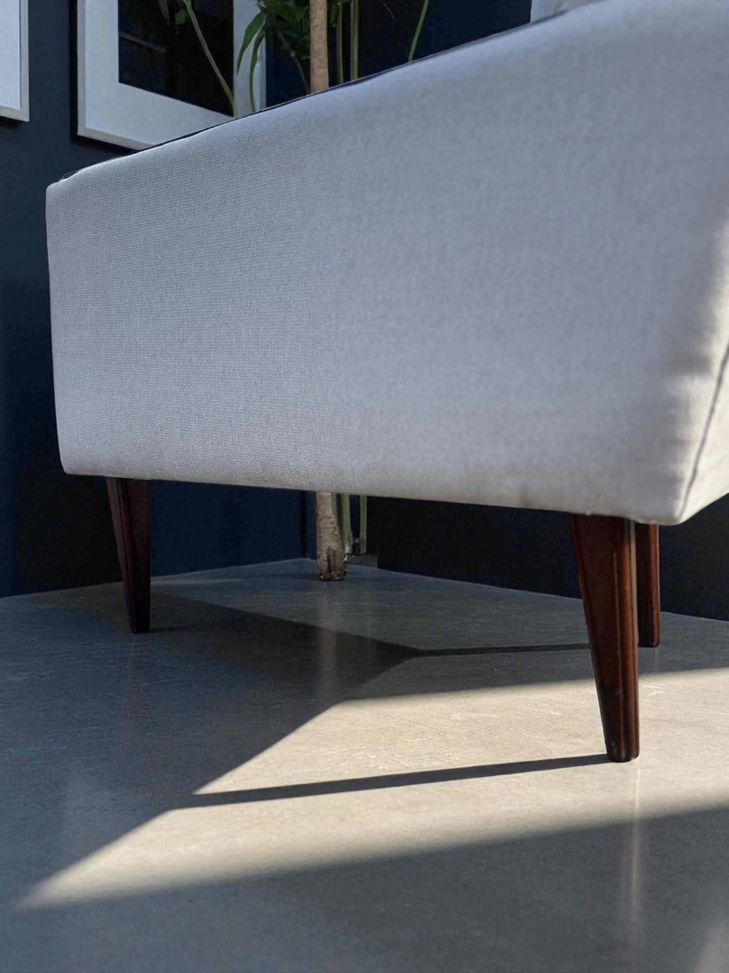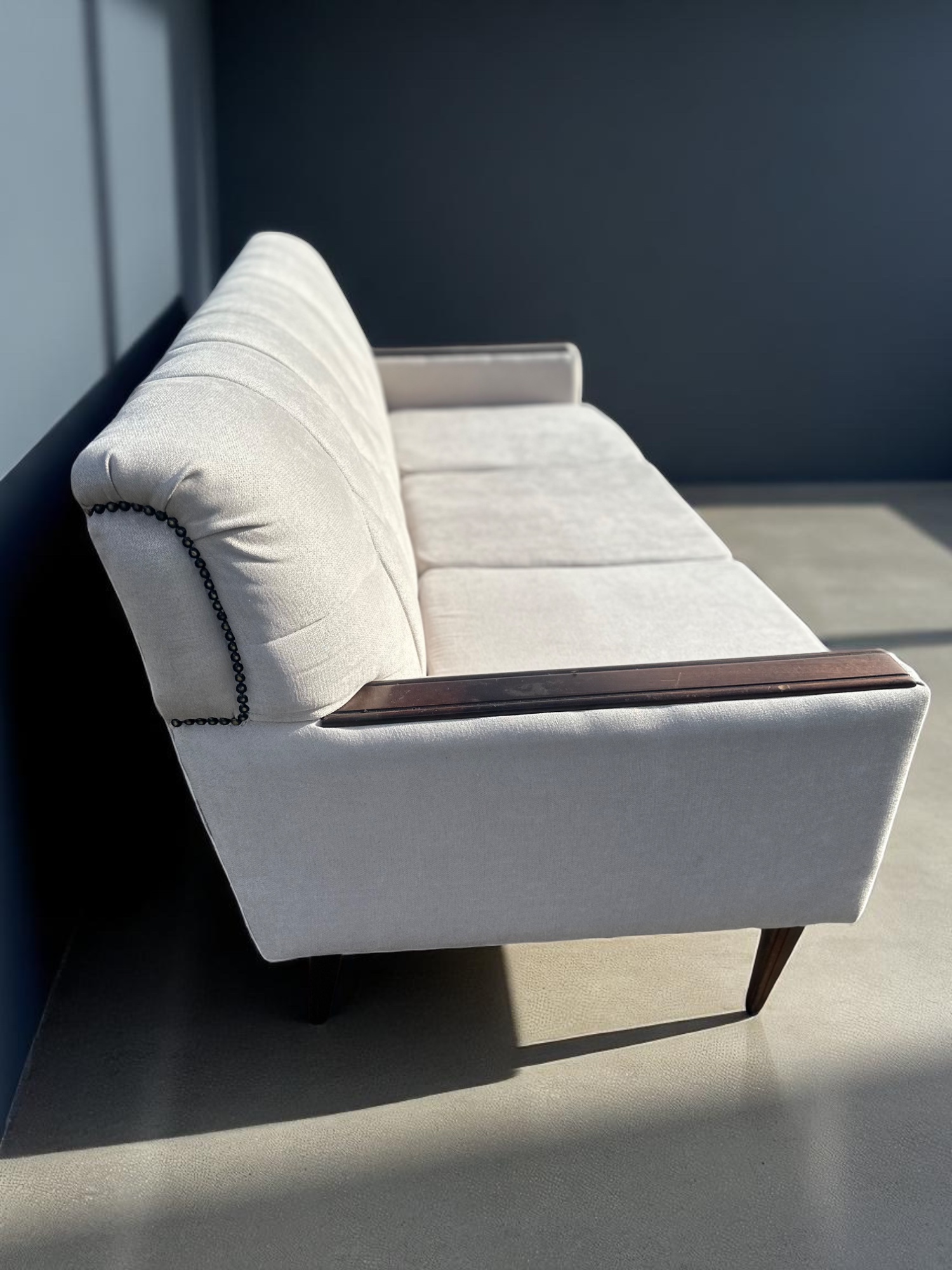 Or as low as R2083,34 / month interest-free, using your existing credit card. For orders over R2000,00.How it worksA newly restored mid-century style sofa in cream upholstery, featuring deep tufting and dark hardwood armrest trim – a sophisticated statement for any space.Shop this cream mid-century 3-seater sofa with dark hardwood trim. Fully reupholstered and restored – premium comfort meets timeless design. Buy now with Payflex or Float