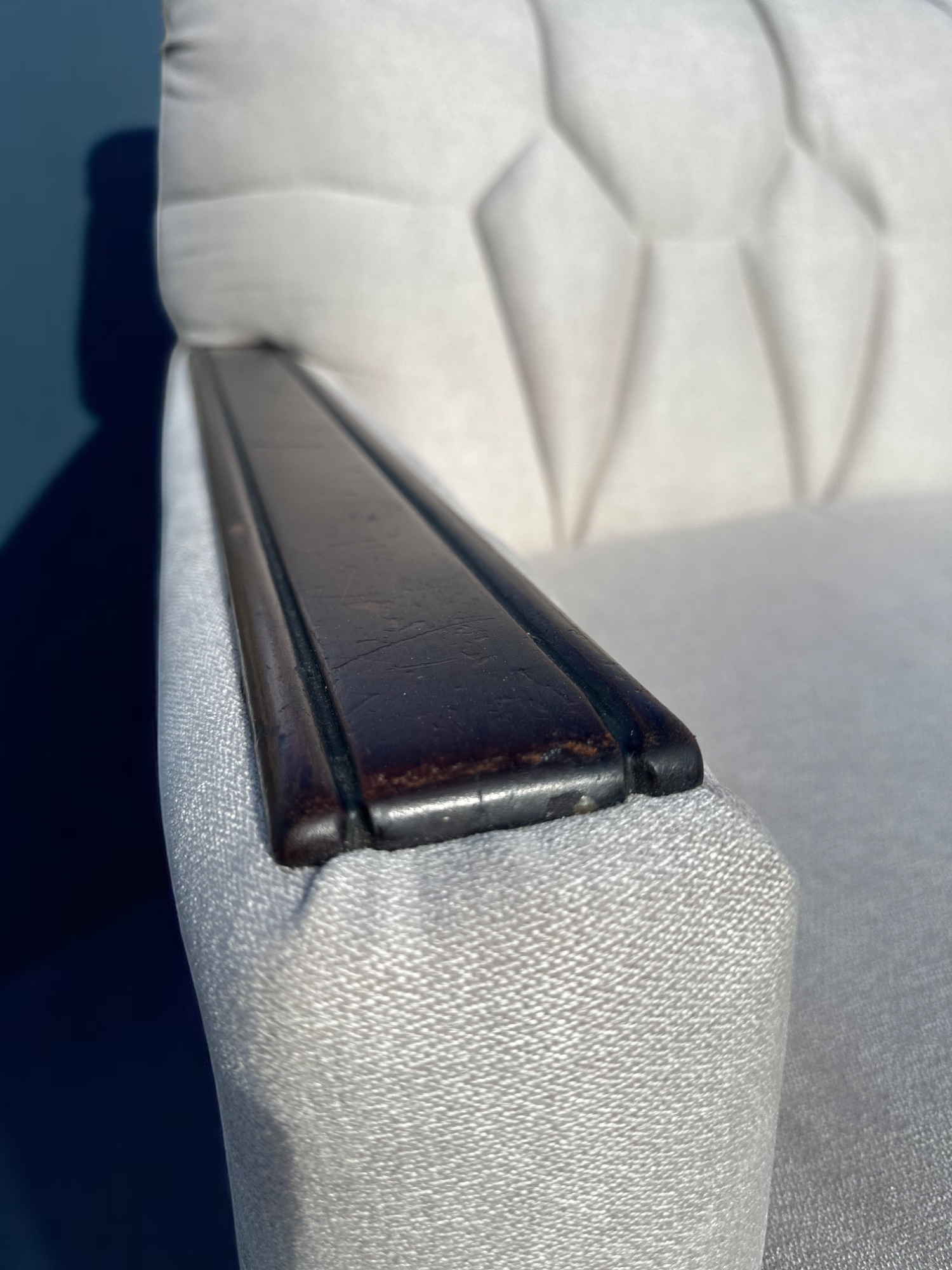 Design Features: Tufted back, wood-trimmed armrests, decorative upholstery tacks