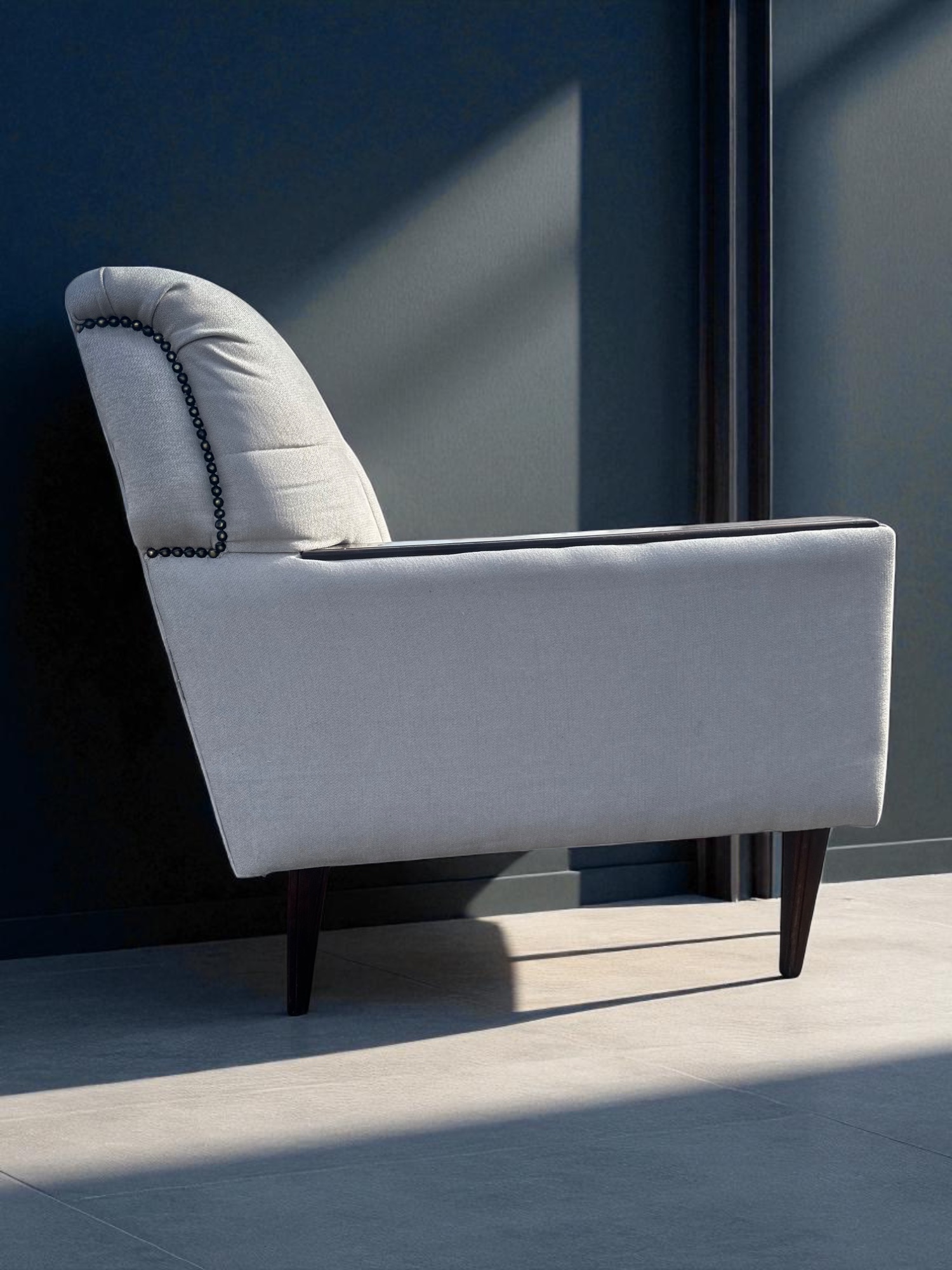 Perfectly proportioned for living rooms, lounges, or office spaces, this piece strikes a refined balance between form and function. Armrests feature dark wooden insets, while a row of decorative upholstery tacks along the back adds a subtle vintage edge.