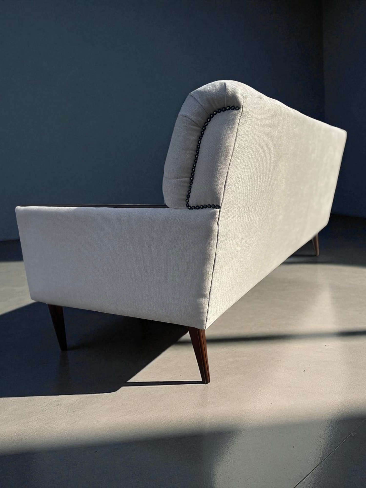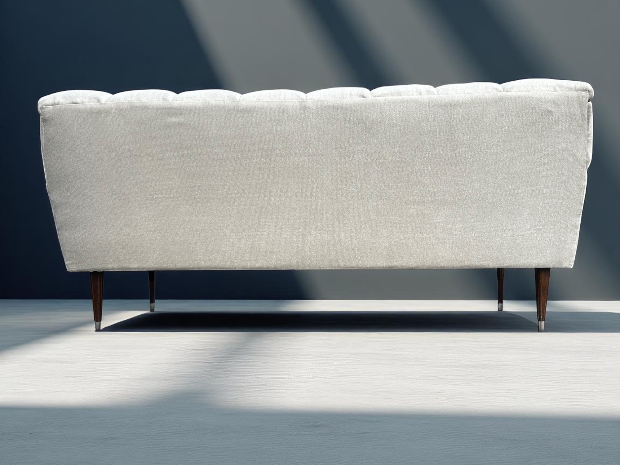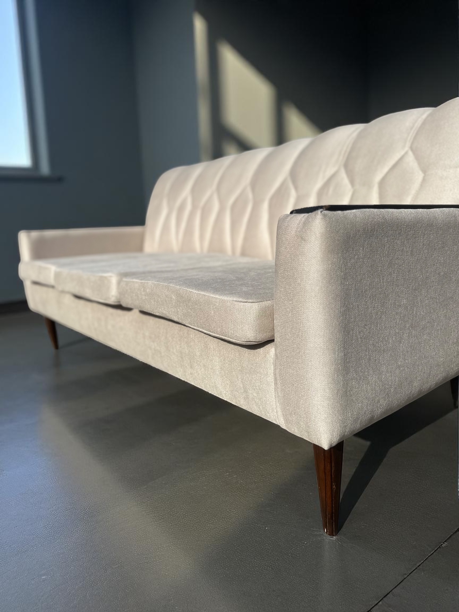 Elevate your living space with this stunning Mid-century cream tufted 3-seater sofa, newly reupholstered in a rich cream textile and beautifully restored for modern interiors. Its distinctive tufted backrest adds timeless character, while the sleek dark hardwood trim and tapered legs speak to high-end craftsmanship.