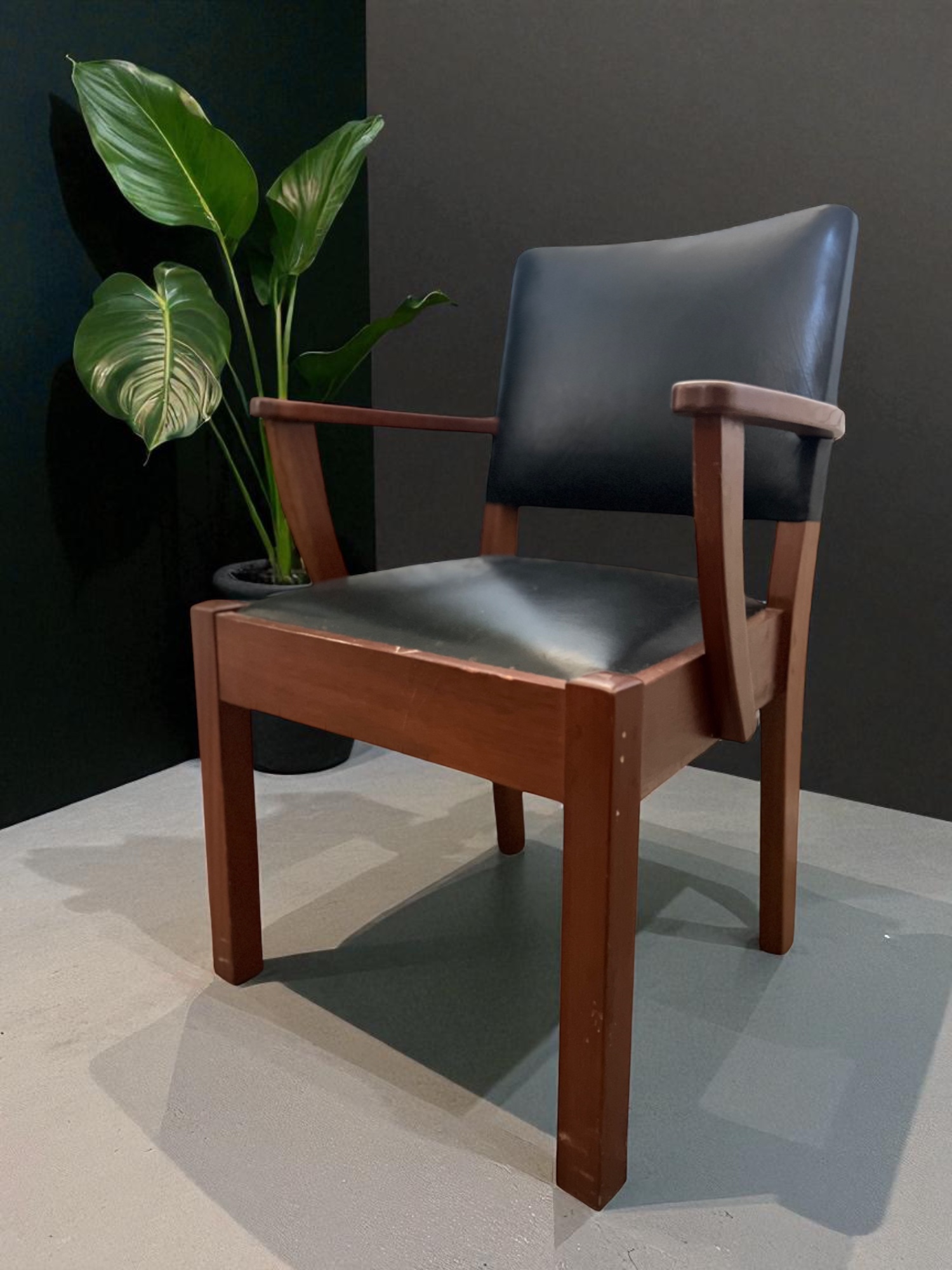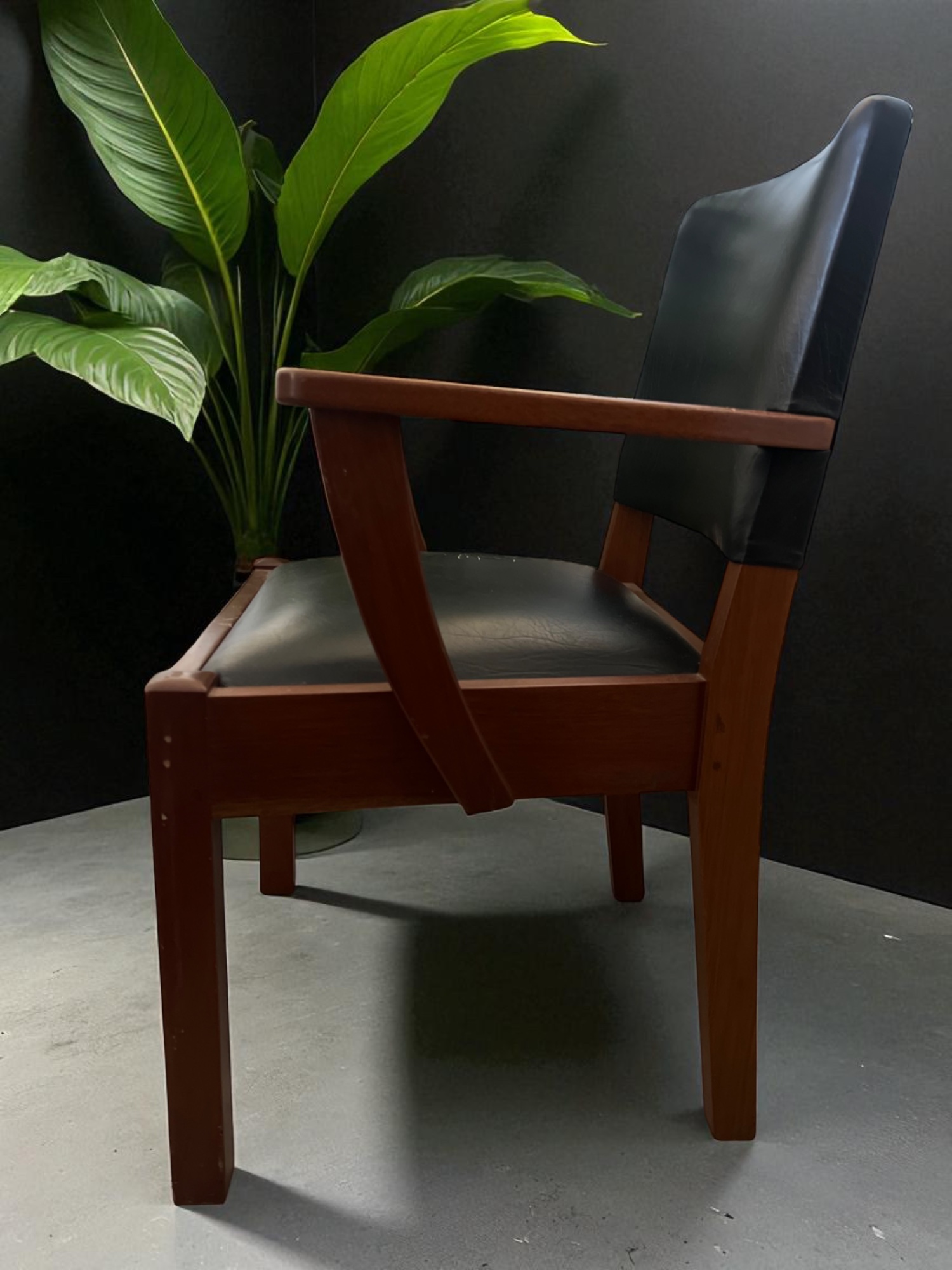 Add an artistic and story-rich element to your interior with this Vintage wood armchair with floral cracked leather seat, featuring genuine black leather upholstery and a naturally formed floral crack on the seat. Rather than diminishing the chair’s charm, the floral mark adds unique character, speaking to decades of craftsmanship and use. The chair’s sturdy hardwood frame exudes stability and warmth, while the gently curved armrests enhance comfort and visual appeal.