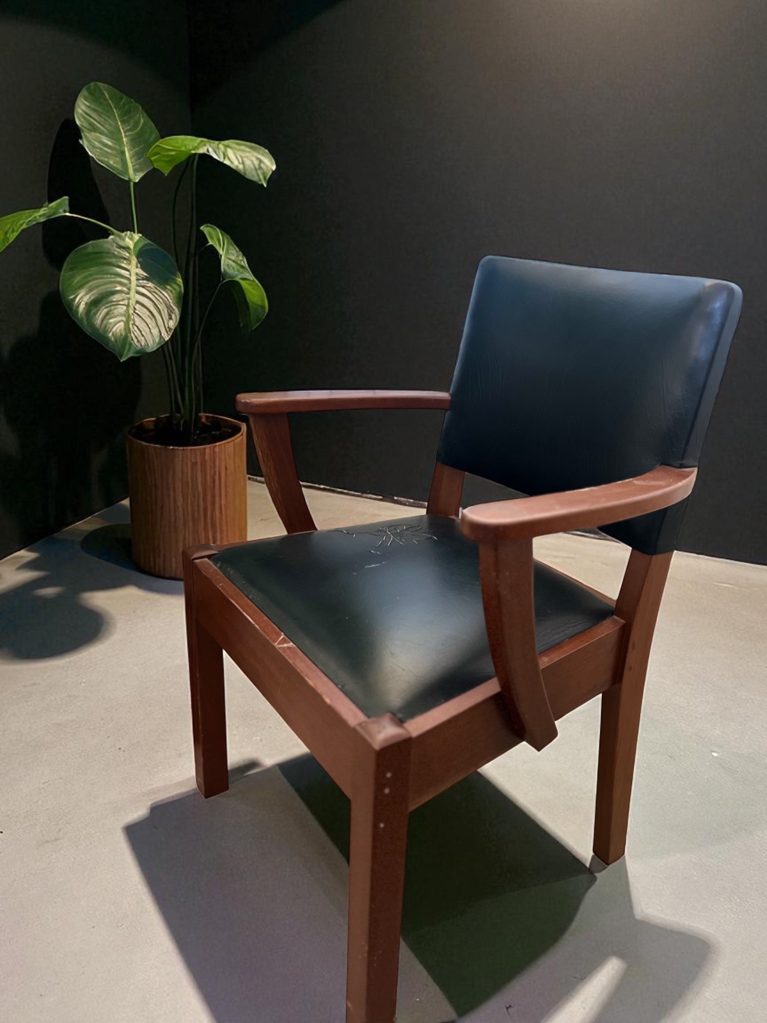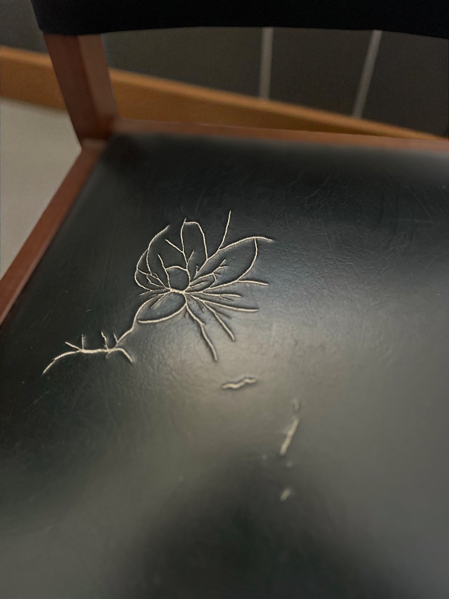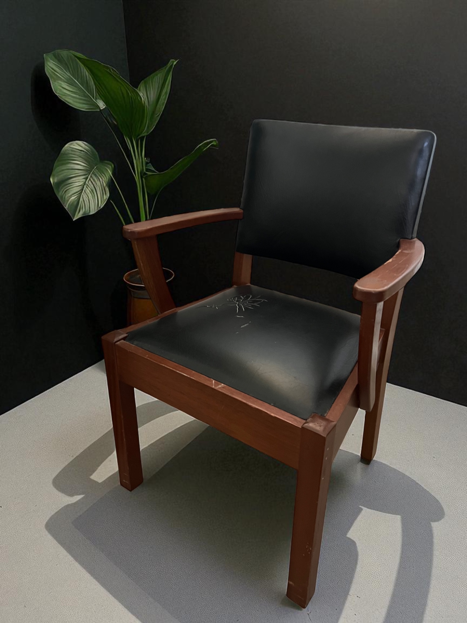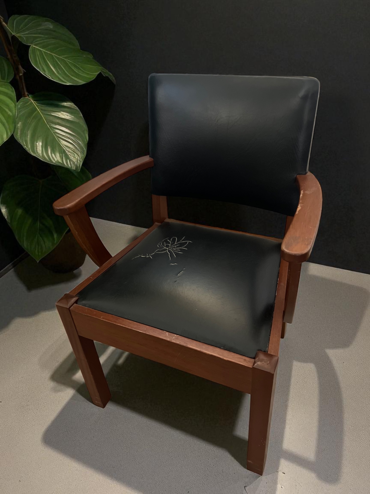 Vintage wood armchair with genuine leather and a unique floral crack detail. Statement seating that celebrates imperfections.